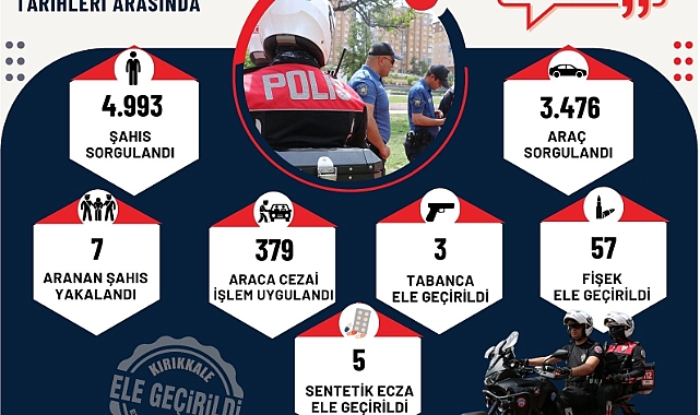 Kırıkkale Emniyet Müdürlüğü 18-24.06.2024 tarihleri arasında İlimiz genelinde yapılan Şok Uygulamalar kapsamında; Ekiplerimizce yapılan çalışmalarda 4.993 şahıs ve 3.476 araç sorgulanmış, Asayiş olaylarına karıştıkları tespit edilerek çeşitli suçlardan aranan 7 şüpheli yakalanarak adli makamlarca işlem yapılmış, aralarında çevreye rahatsızlık verdiği gerekçesiyle de 379 araca cezai işlem uygulanmıştır.