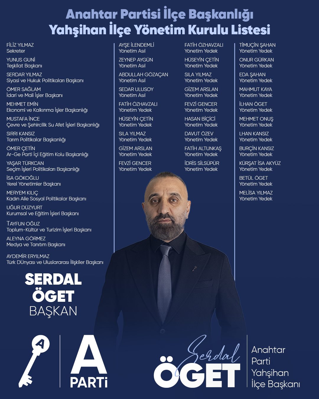 Anahtar Parti Yahşihan İlçe Başkanı Serdar Öget, partisinin yeni ilçe yönetim kurulu listesini duyurdu.