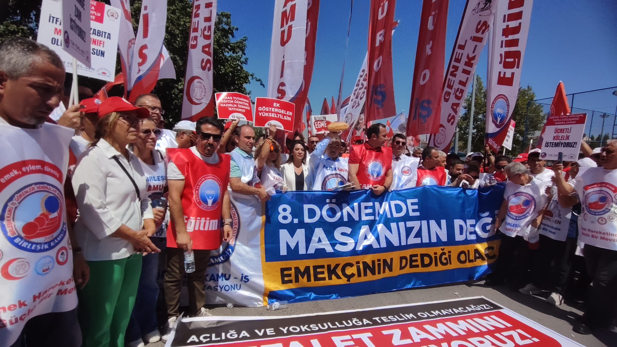 Saim Cengiz yaptığı açıklamada; Konfederasyonumuz Birleşik Kamu-İş ve bağlı sendikalar olarak kamu çalışanlarına ve kamu emeklilerine reva görülen zam teklifini protesto etmek için iş bıraktık; Anıtpark’tan Çalışma ve Sosyal Güvenlik Bakanlığı’na yürüdük.