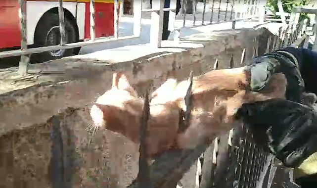Kırıkkale’de korkuluk demirlerine saplanan kediyi itfaiye ekipleri kurtardı.