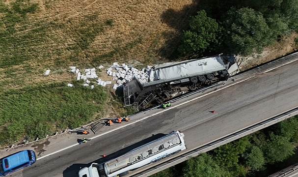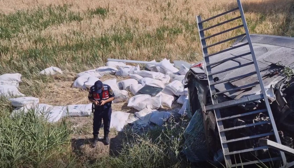 Kaza nedeniyle devrilen tırın dorsesinde bulunan un çuvalları çevreye savrulurken, kaza ile ilgili inceleme başlatıldı.
